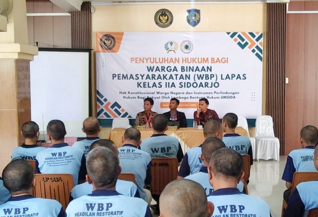 Sidoarjo, 12 September 2025 – Lembaga Konsultasi dan Bantuan Hukum Universitas Muhammadiyah Sidoarjo (LKBH UMSIDA) menyelenggarakan Kegiatan penyuluhan hukum dengan Warga Binaan Pemasyarakatan (WBP) di Lapas Kelas IIA Sidoarjo. Kegiatan ini mengusung tema “Hak Konstitusional Warga Negara dan Instrumen Perlindungan Hukum Bagi Rakyat” dengan menghadirkan Narasumber dari Advokat LKBH UMSIDA yaitu Riyawandi, S.H.